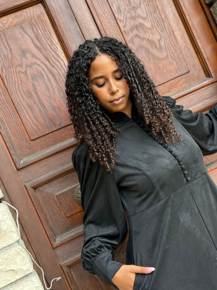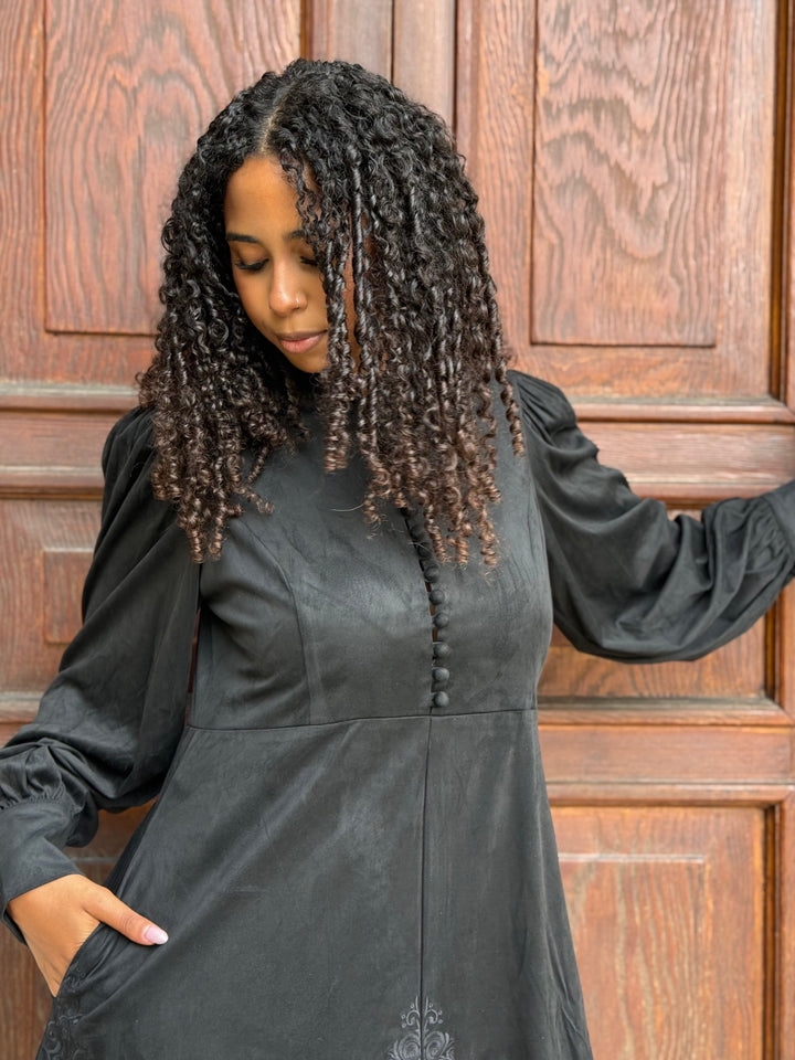 meraviglioso abito AMOSA dall'allure boho-chic in suede, con collo alla coreana impreziosito da ricami tono su tono e nappine.