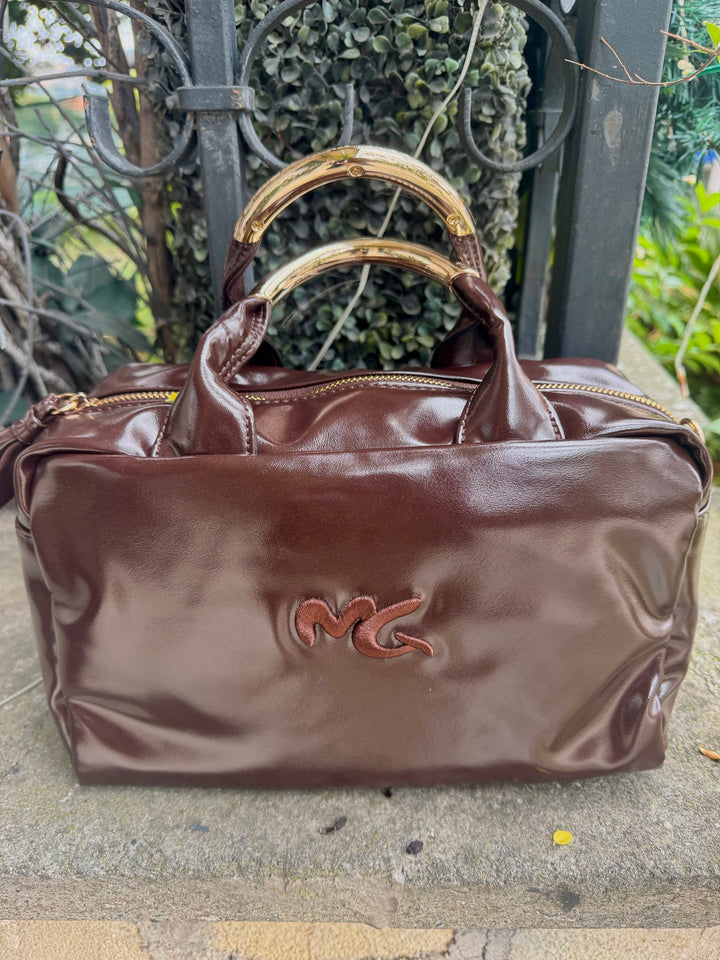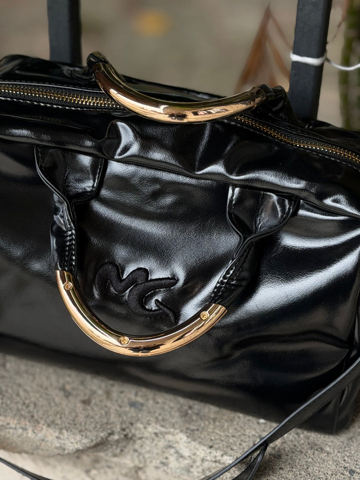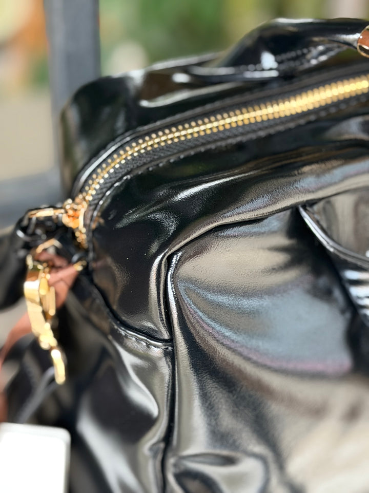 Splendido e particolare, bauletto lucido MANILA GRACE, con manici in metallo e tracolla amovibile.