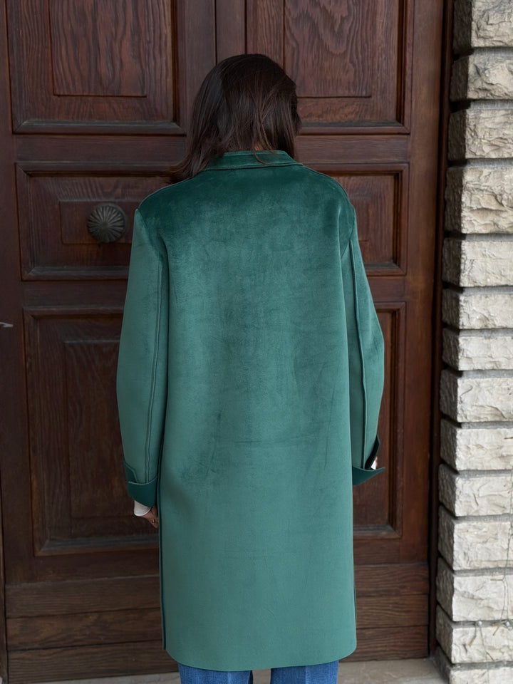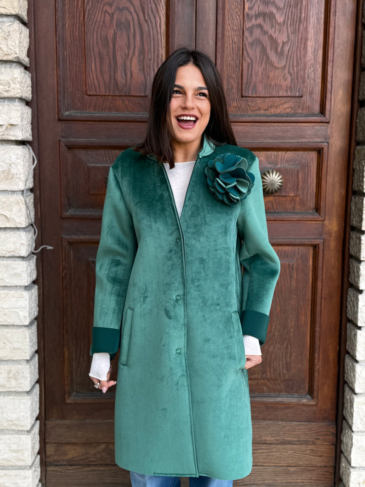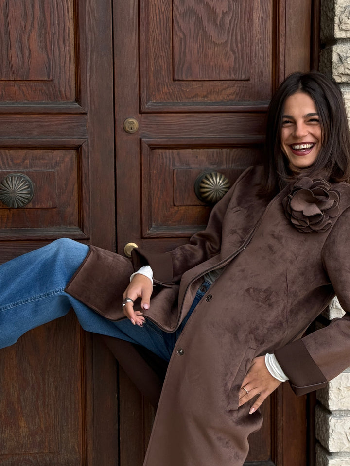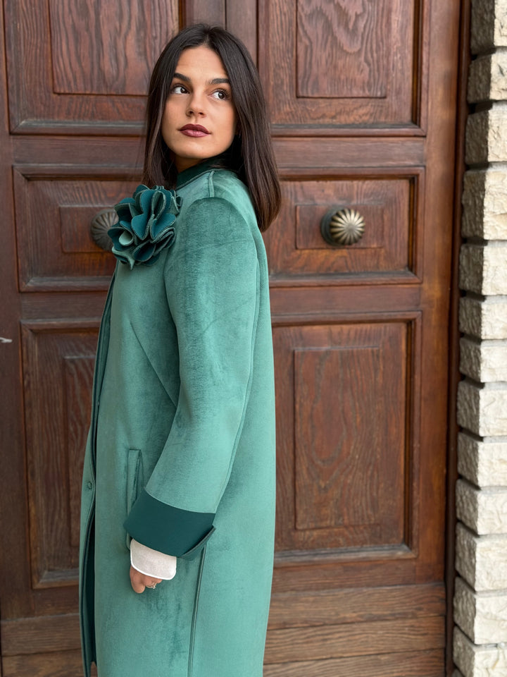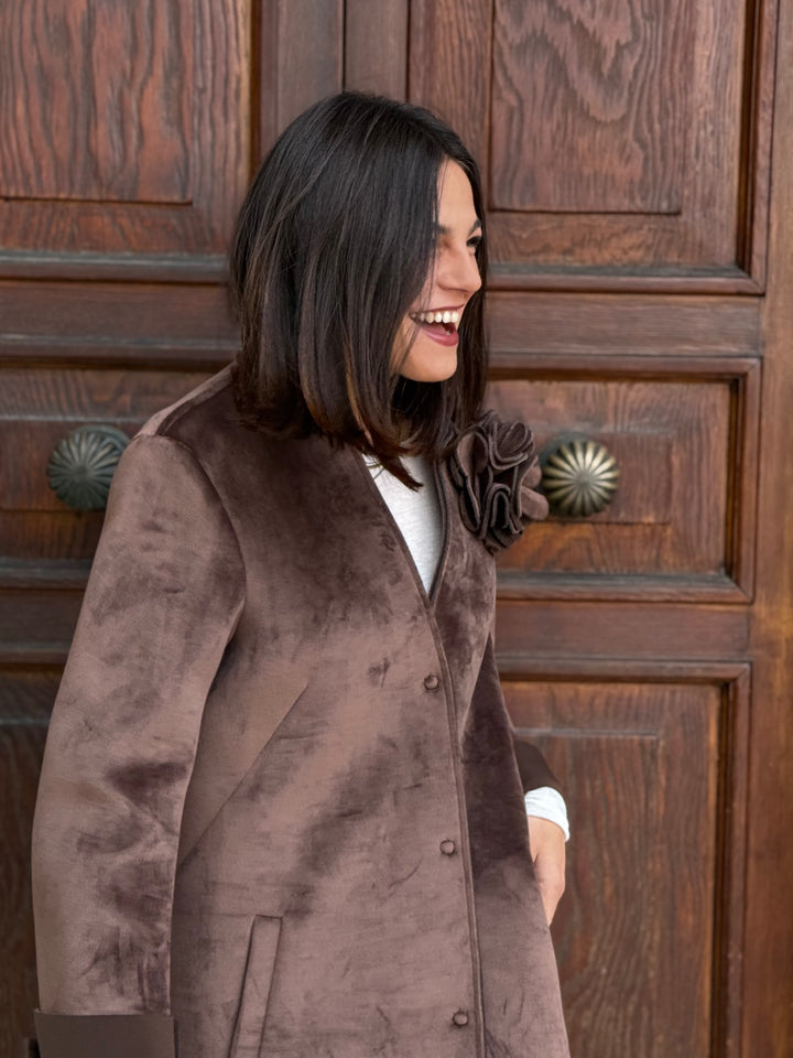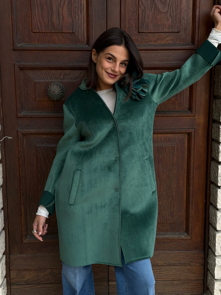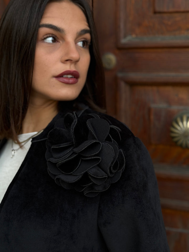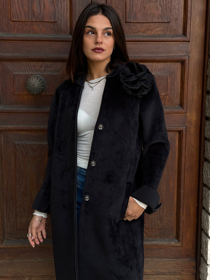 Cappotto monopetto TENSIONE IN in neoprene effetto velluto, morbidissimo, con tasche, colletto, polsini e applicazione rimovibile.