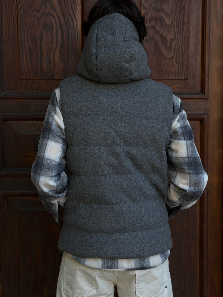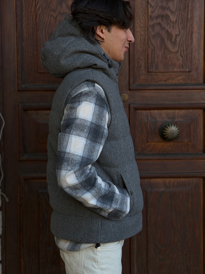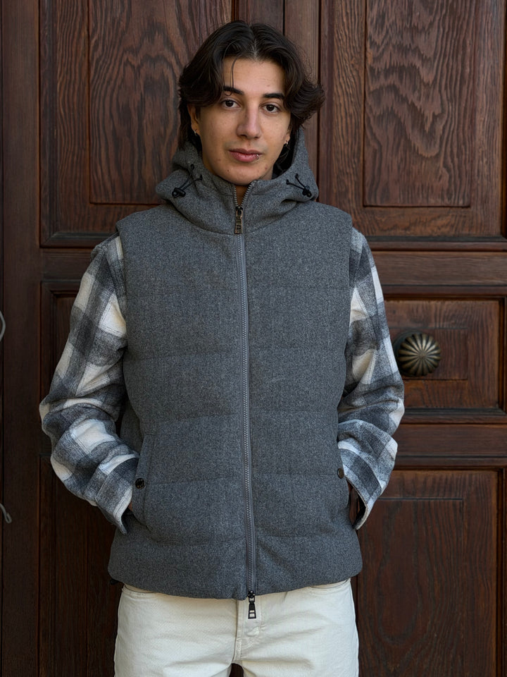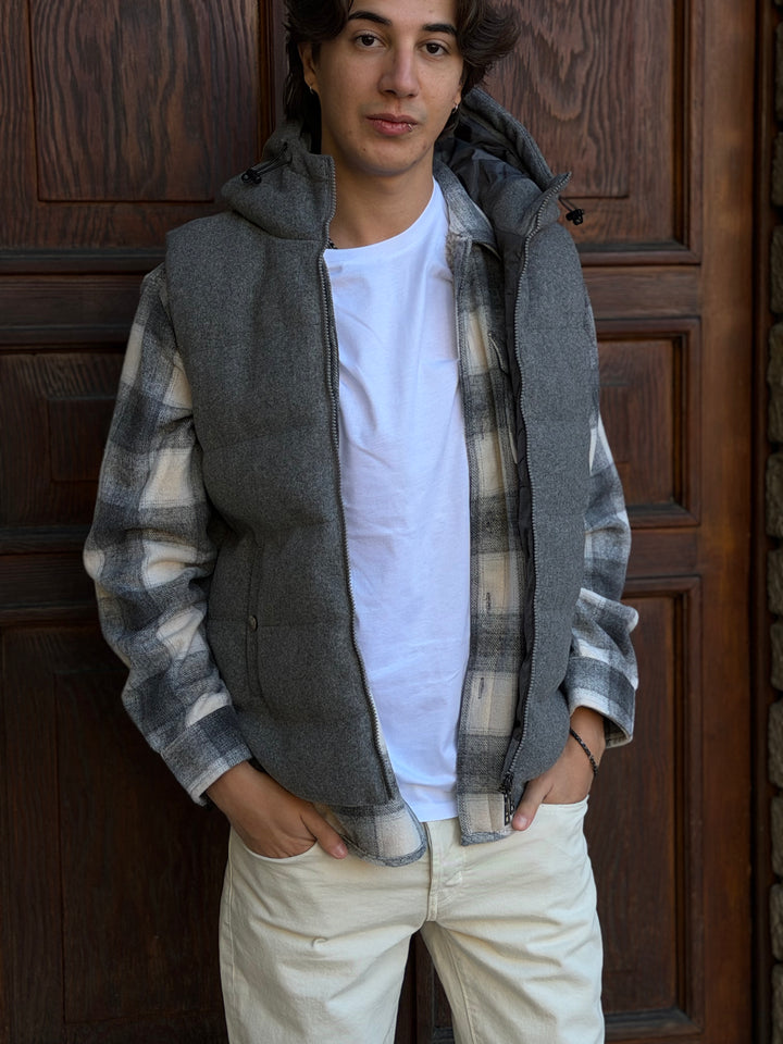 Piumino smanicato da uomo in flanella trapuntata, con cappuccio.