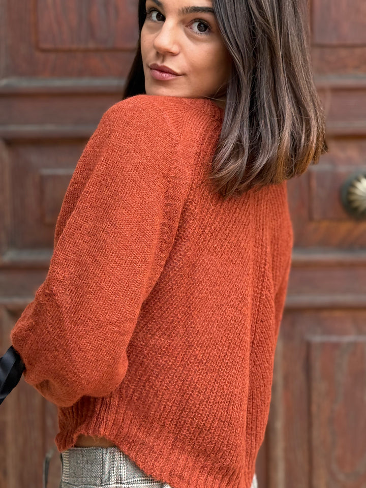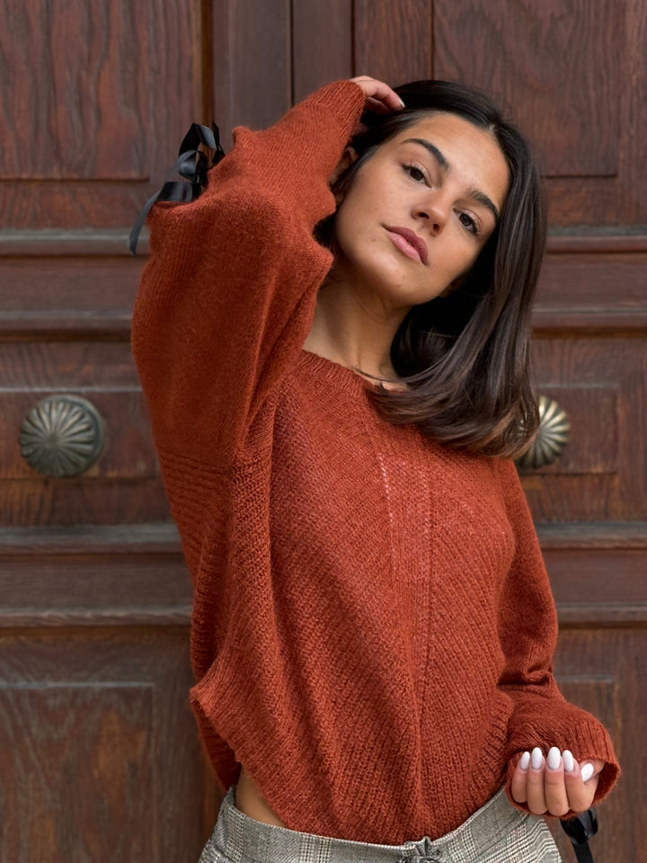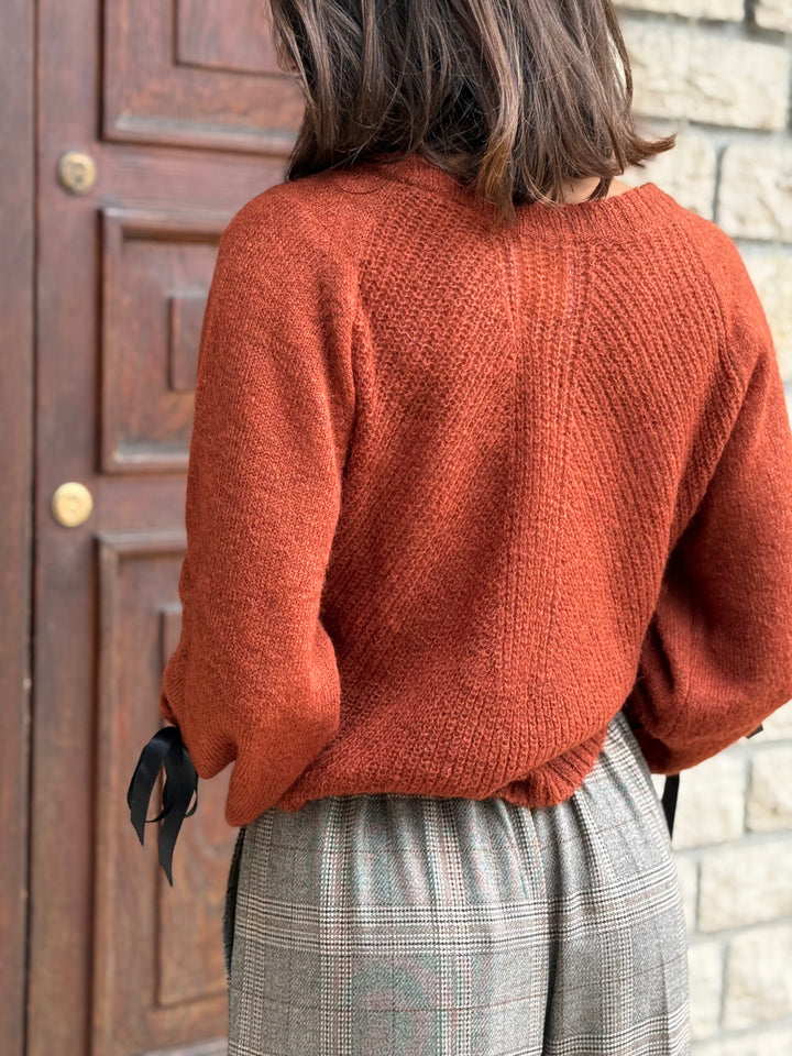 Questo colore è un must per questa stagione! Pullover misto alpaca color ruggine, con fiocchi in raso neri sulle maniche.