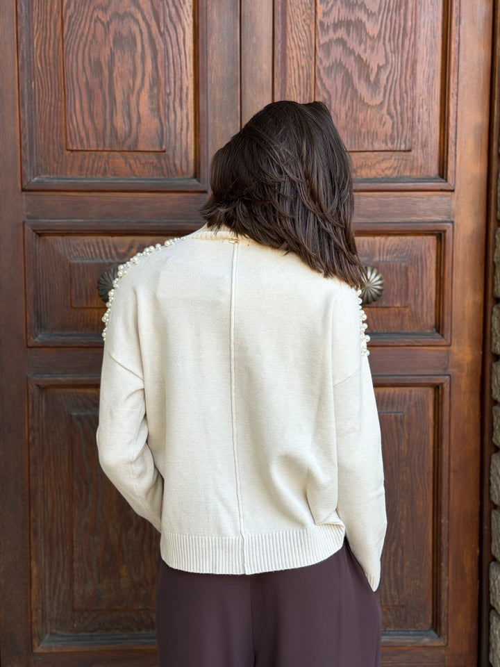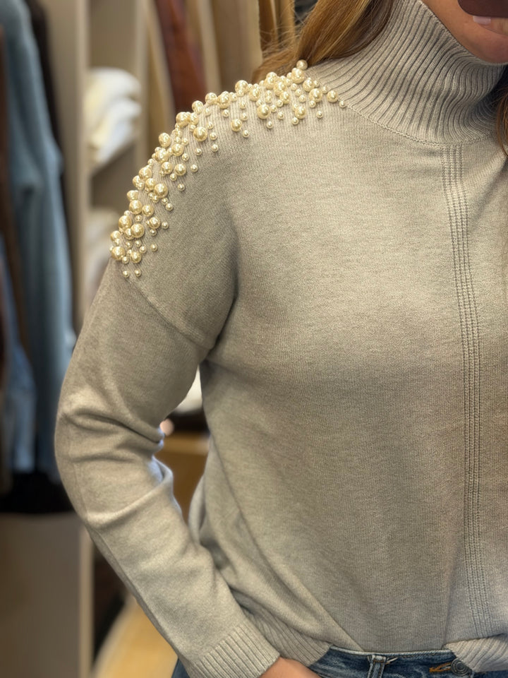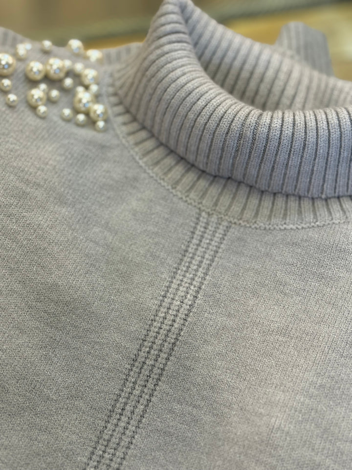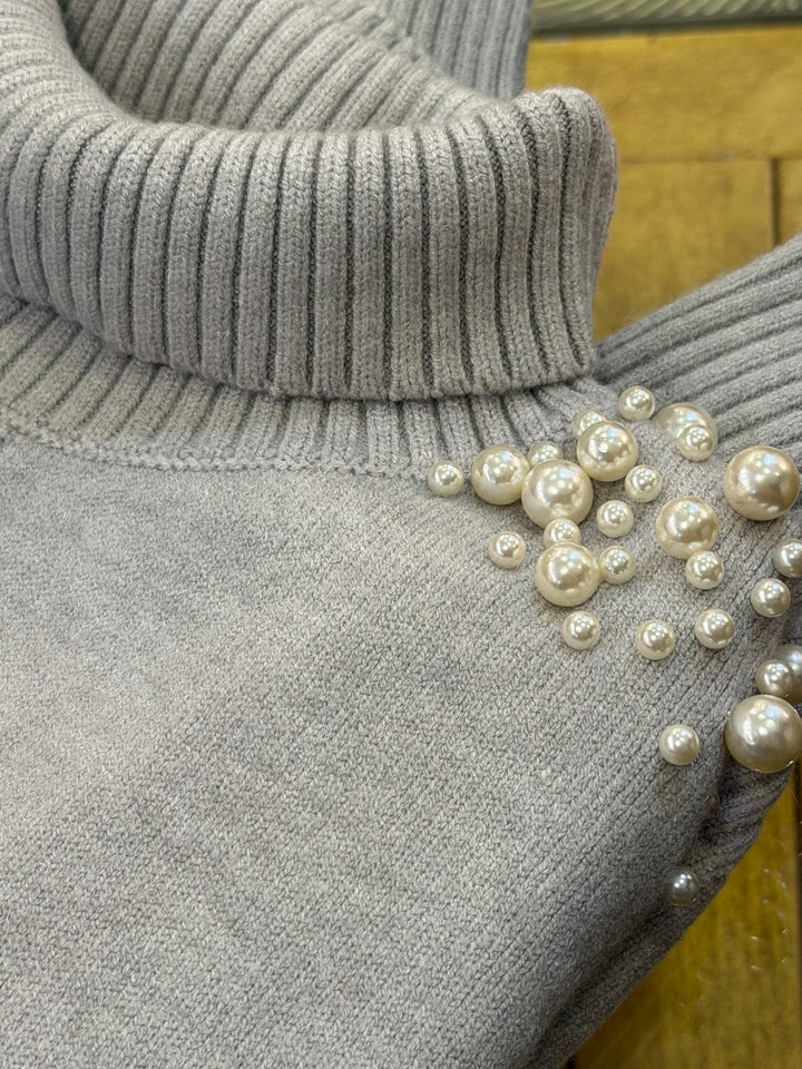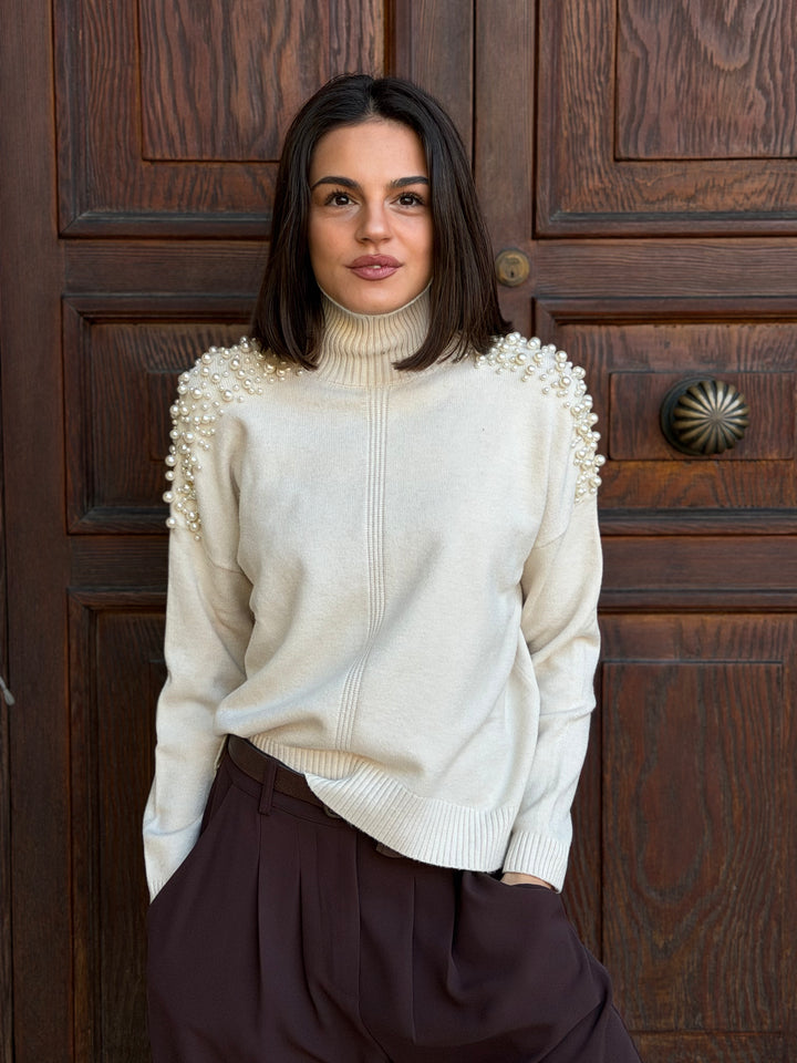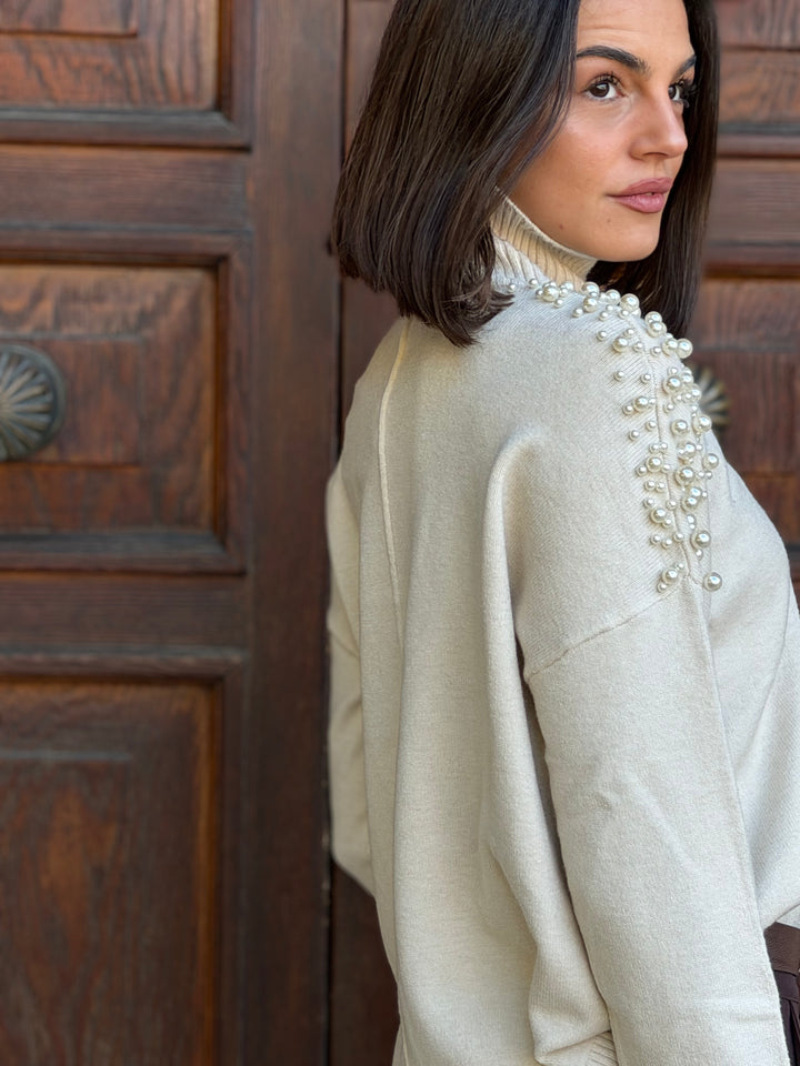 Pullover donna colloalto con perle applicate sulle spalle, wool blend in misto viscosa