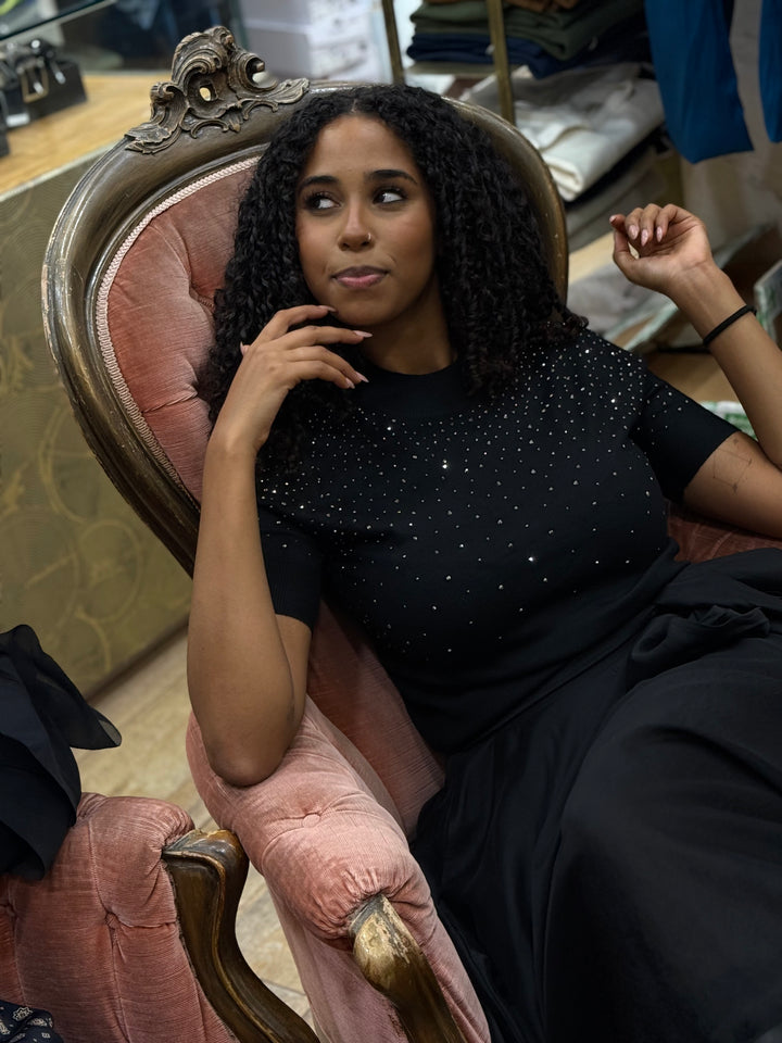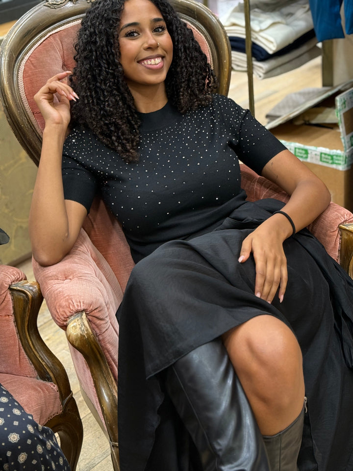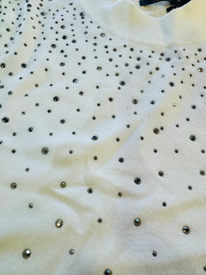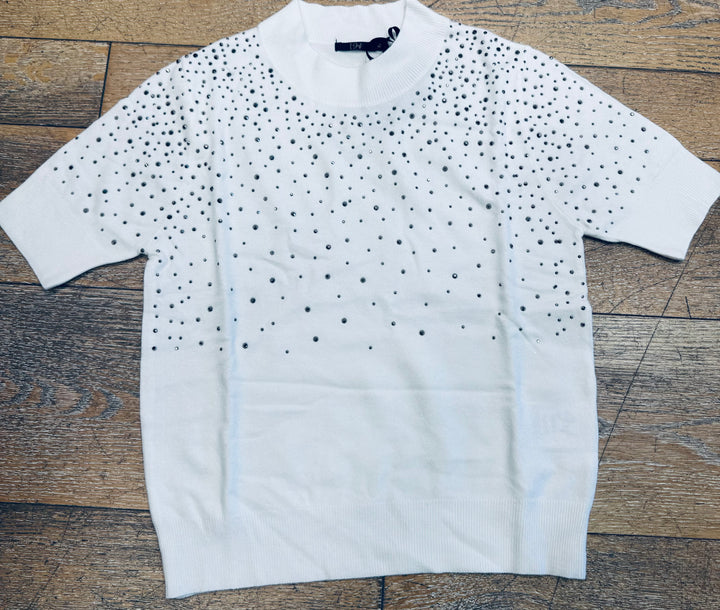 Prezioso e comfy, pullover in misto viscosa con maniche corte tempestato di cristalli.