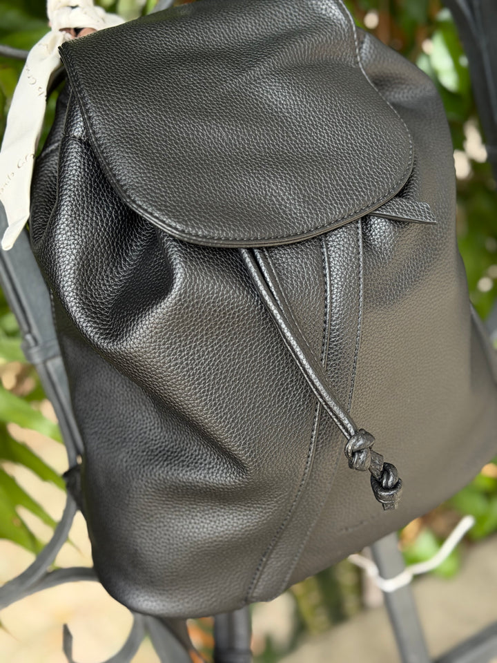 Zainetto in ecopelle martellata con patta e spallacci in tessuto, dettagli oro, tasche interne e foulard.